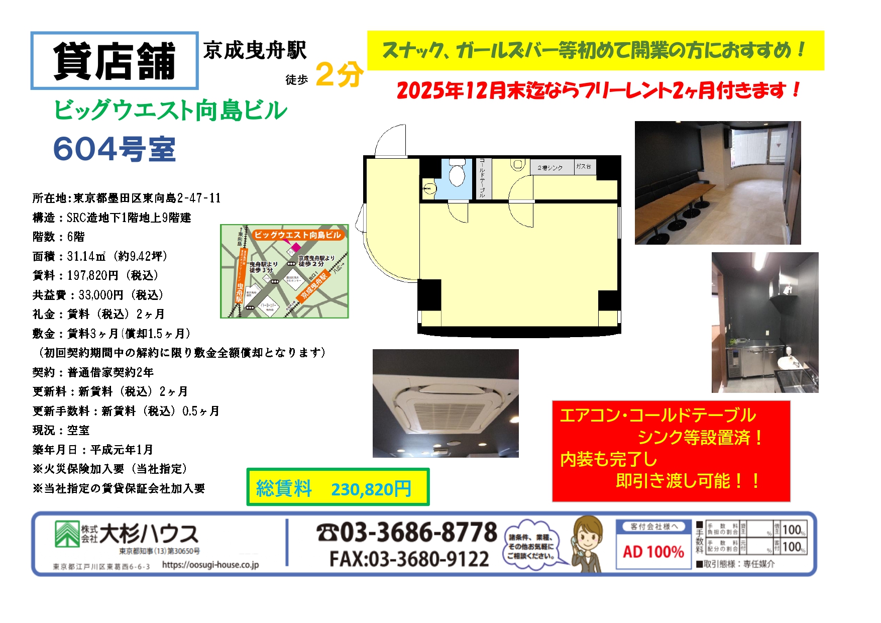 | 物件名 | ビッグウエスト向島ビル 604号室 | 募集区画 | 6階 |